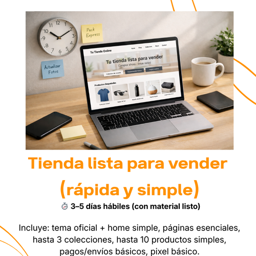 En 3–5 días hábiles (con material listo) te dejo pagos + envíos + pixel básico configurados para que empieces a vender en serio, no solo “vitrinear”.