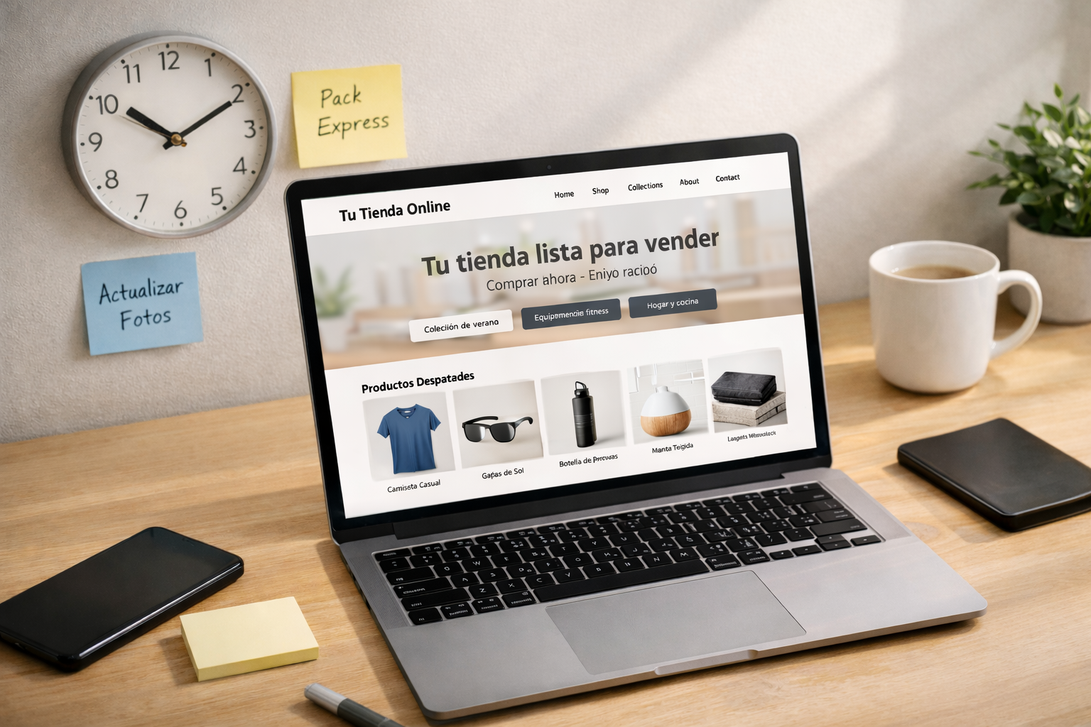 En 3–5 días hábiles (con accesos + material listo) te dejo tu Shopify lista para cobrar y despachar, sin enredos.